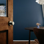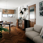 影になる部分の壁にあえてWモリスの濃いブルーの壁紙を貼り、陰影にメリハリをつけると同時に、床をヘリンボーン柄とすることで光の具合を調整し、時間による家族の居場所の移ろいに同調する空間が出来上がりました。